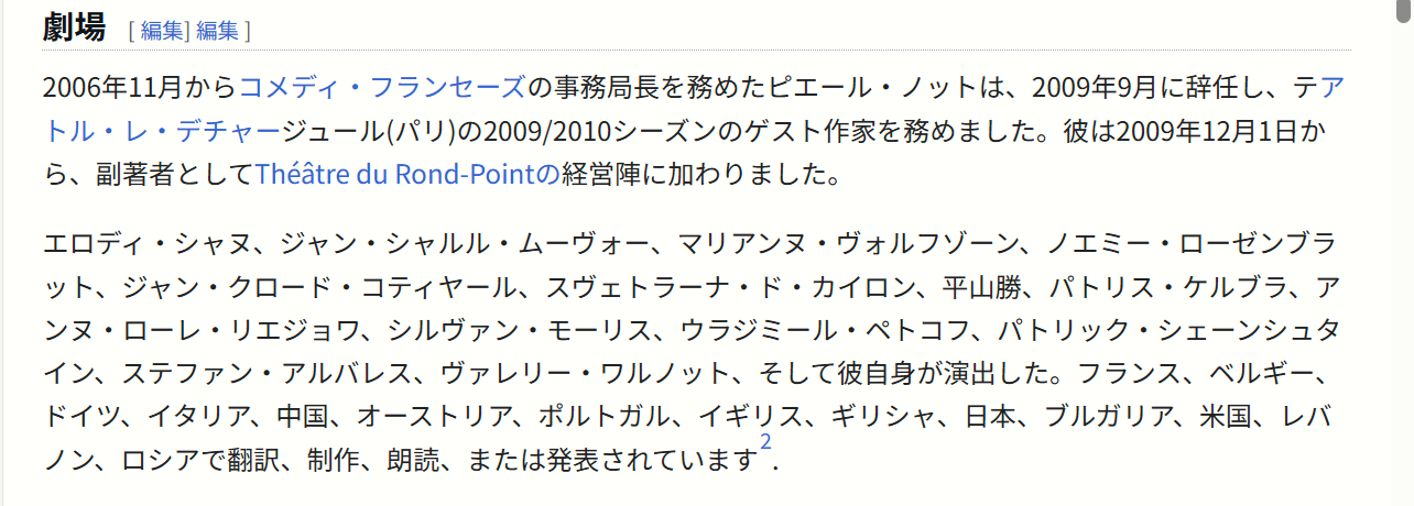 それから、「翻訳劇云々ー」という言語の問題については、原文と上演された舞台を比較すれば、自ずと分かるはずであるが、舞台の方が分かりやすくなっている。以前にも言ったが、日本では彼の本を読んだだけで分かる人はほとんどいないと言ってもよいだろう。したがって、上演するにあったて分かりやすく置き換える作業は必須条件ではあるが、さらにこれ以上言葉を簡略化したり、「分かりやすく」することはピエール・ノットという作家が本来持っているラディカルなものを平板化することにもなり兼ねない。こういう作品を上演する際には、大なり小なり分かる人には分かる、分からない人には分からないということを背負わざるを得ないのだろうが、それにしても今日の日本の文化状況については危機感を感じる。
